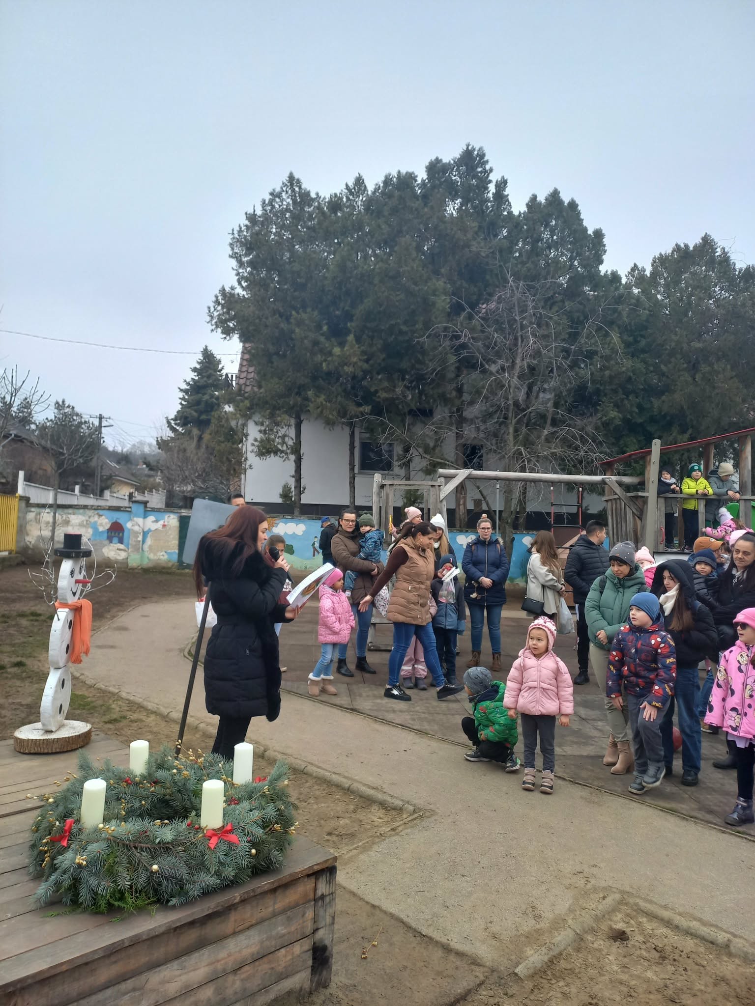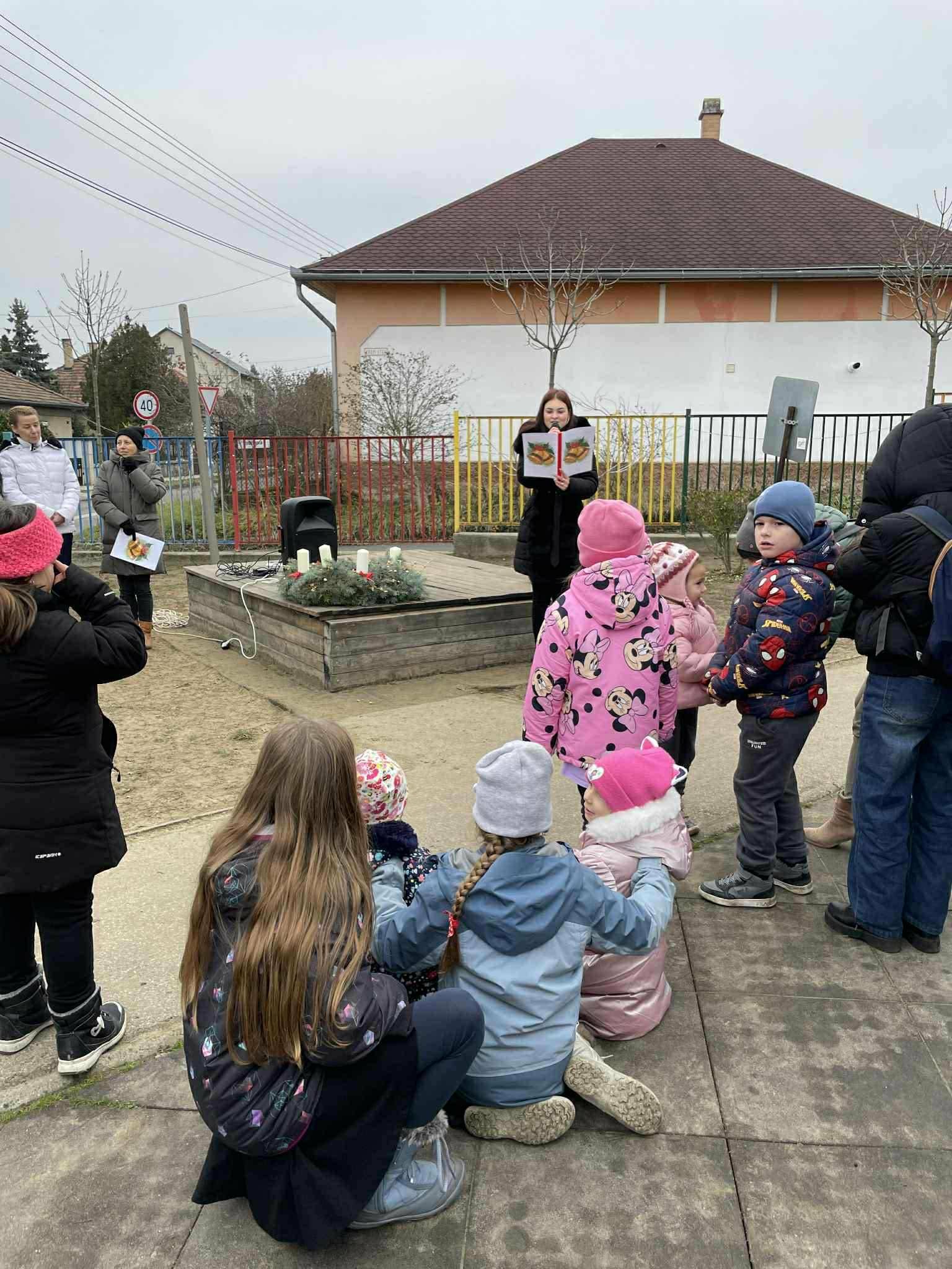Az Adventi családi nap zárasaként óvodánk udvarán az óvodapedagógusok közös éneklése, valamint Farkas Cintia volt óvodásunk adventi hangulatú előadása tette még ünnepélyesebbé.